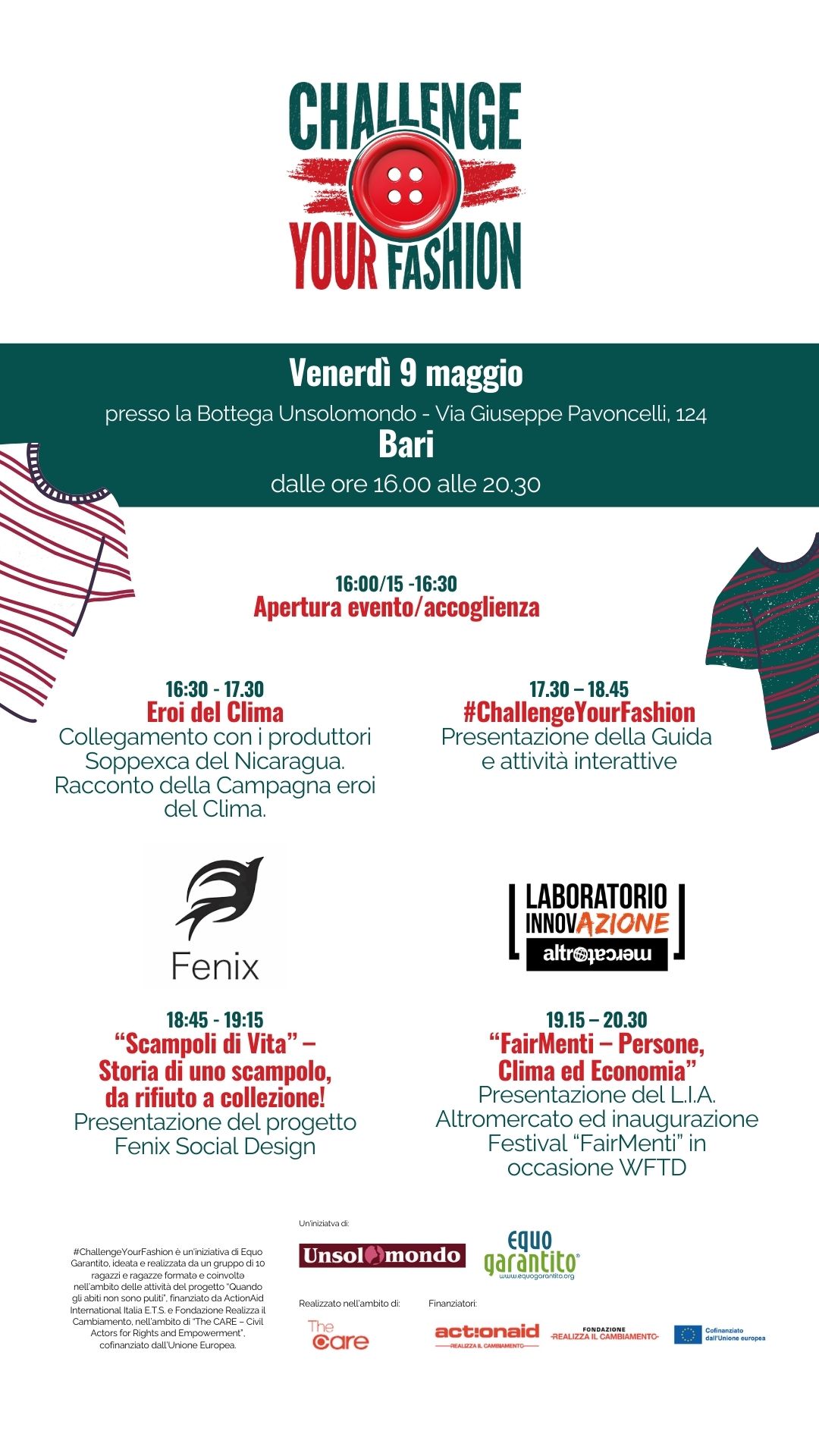 In occasione della Giornata Mondiale del Commercio Equo e Solidale, Unsolomondo in Bottega in Via Pavoncelli 124 a Bari, il 9 Maggio propone l'adesione alla campagna #challengeyourfashion.
