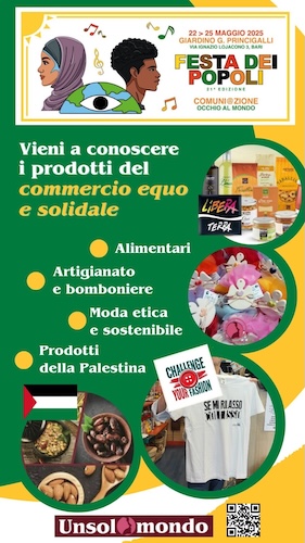 In occasione della Giornata Mondiale del Commercio Equo e Solidale, Unsolomondo in Bottega in Via Pavoncelli 124 a Bari, il 9 Maggio avvia il Festival FairMenti.