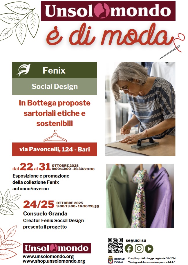 Venerdì 24 e Sabato 25 ottobre 2025, la Cooperativa Unsolomondo ospita a Bari in Via Pavoncelli 124 l’esperienza del Laboratorio Sartoriale Sociale Fenix. L’incontro con la Social Design Creator, Consuelo Granda, è occasione di conoscenza e condivisione dell’esperienza Slow Fashion del Laboratorio Fenix.