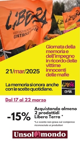 Ti aspettiamo in Bottega, potrai scegliere i prodotti di Libera Terra coltivati in terre e beni confiscati alle mafie, con un piccolo sconto, che non grava sui produttori.