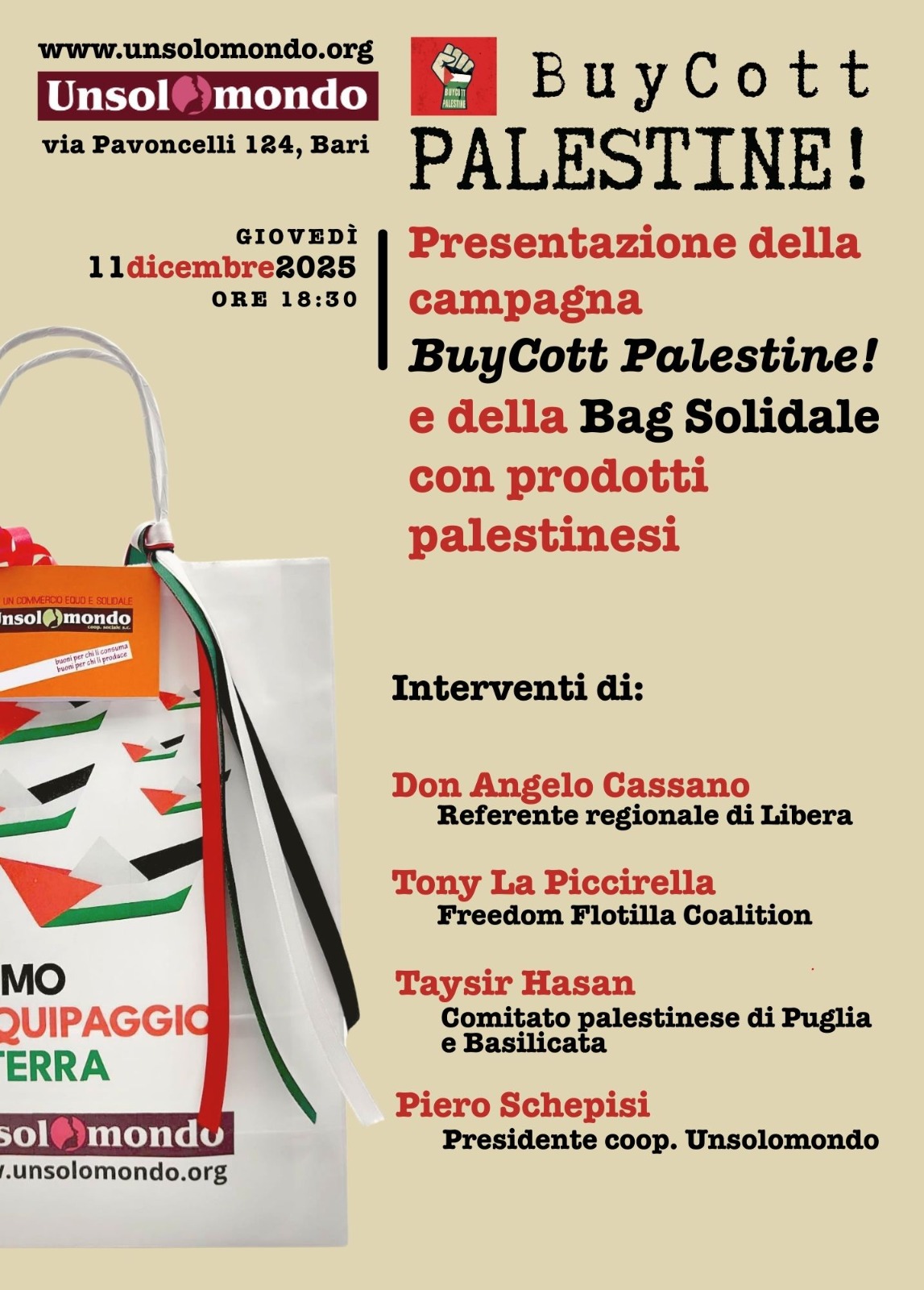 Giovedì 11 dicembre 2025 alle ore 18:30, la Cooperativa Unsolomondo ospita a Bari, in Via Pavoncelli 124, la presentazione della campagna BuyCott Palestine! con esperienze e voci dalla Palestina e da iniziative di giustizia sociale. Durante l’incontro sarà presentato anche il progetto Bag Solidale a sostegno della popolazione palestinese.