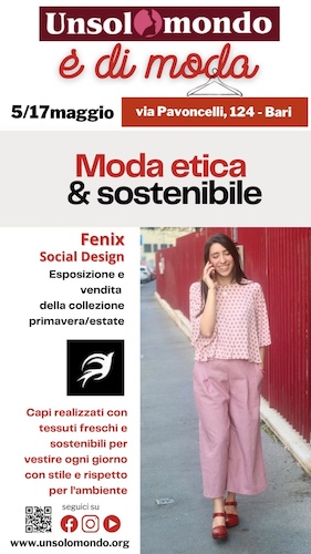 Proposte di una moda etica e sostenibile, Unsolomondo ospita in Bottega in Via Pavoncelli 124 a Bari, la collezione primavera-estate realizzate dal Laboratorio Sociale Fenix. Tessuti di qualità, recuperati per una economia circolare, lavorati con cura ed amore, senza sprechi e senza inquinamento, rispettosi per chi lavora e per l'ambiente.