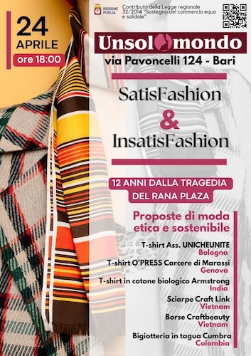 Giovedì 24 aprile 2025, dalle ore 18:00, la Cooperativa Unsolomondo presenta a Bari in Via Pavoncelli 124 l’esperienza e le proposte di moda etica e solidale in memoria delle vittime del 24 aprile 2013 del Rana Plaza a Dacca in Bangladesh – la più grave tragedia della storia della moda.