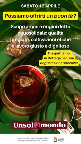 Sabato 12 aprile in Bottega in Via Pavoncelli, 124 Bari parliamo e gustiamo fragranti tè di giustizia e libertà.