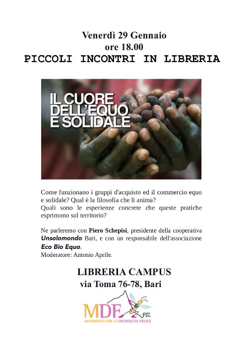 La Puglia è la prima regione del Sud ad avere una legge ad hoc sul commercio equo e solidale. L’approvazione all'unanimità il 22 luglio 2014. Iniziative di sensibilizzazione al consumo critico nelle scuole, formazione di nuovi operatori nel settore equo, promozione dei prodotti solidali negli enti pubblici.