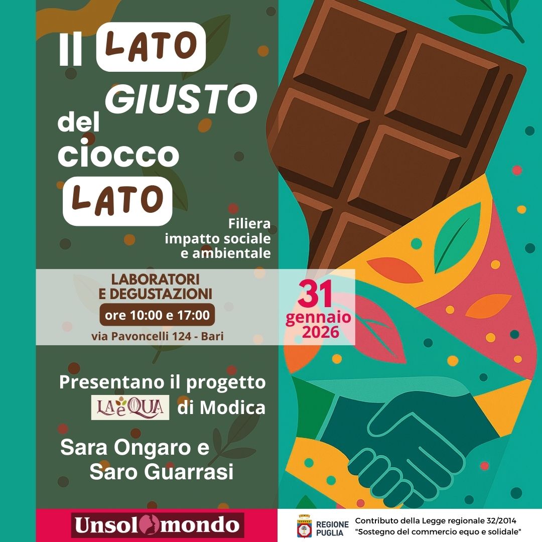 Sabato 31 gennaio 2026 la Cooperativa Unsolomondo ospita a Bari, in Via Pavoncelli 124, i produttori di LAeQUA del cioccolato di Modica (RA). I rappresentanti di LAeQUA esporranno il progetto e realizzeranno un Laboratorio gustativo-sensoriale sulla produzione del delizioso e tradizionale “cioccolato modicano”. L’iniziativa è realizzata nell’ambito del progetto “Liberi ed Equali” finanziato dalla L.R. 32/2014 “Disposizioni per il sostegno e la diffusione del commercio equo e solidale”.
